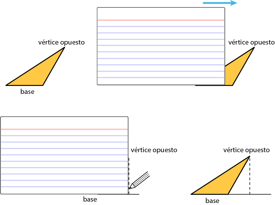 A veces necesitamos extender la recta de la base para identificar la altura, por ejemplo, al buscar la altura de un triángulo obtusángulo o cuando el vértice opuesto no esté directamente sobre la base. En estos casos, el segmento de altura se dibuja, por lo general, fuera del triángulo.