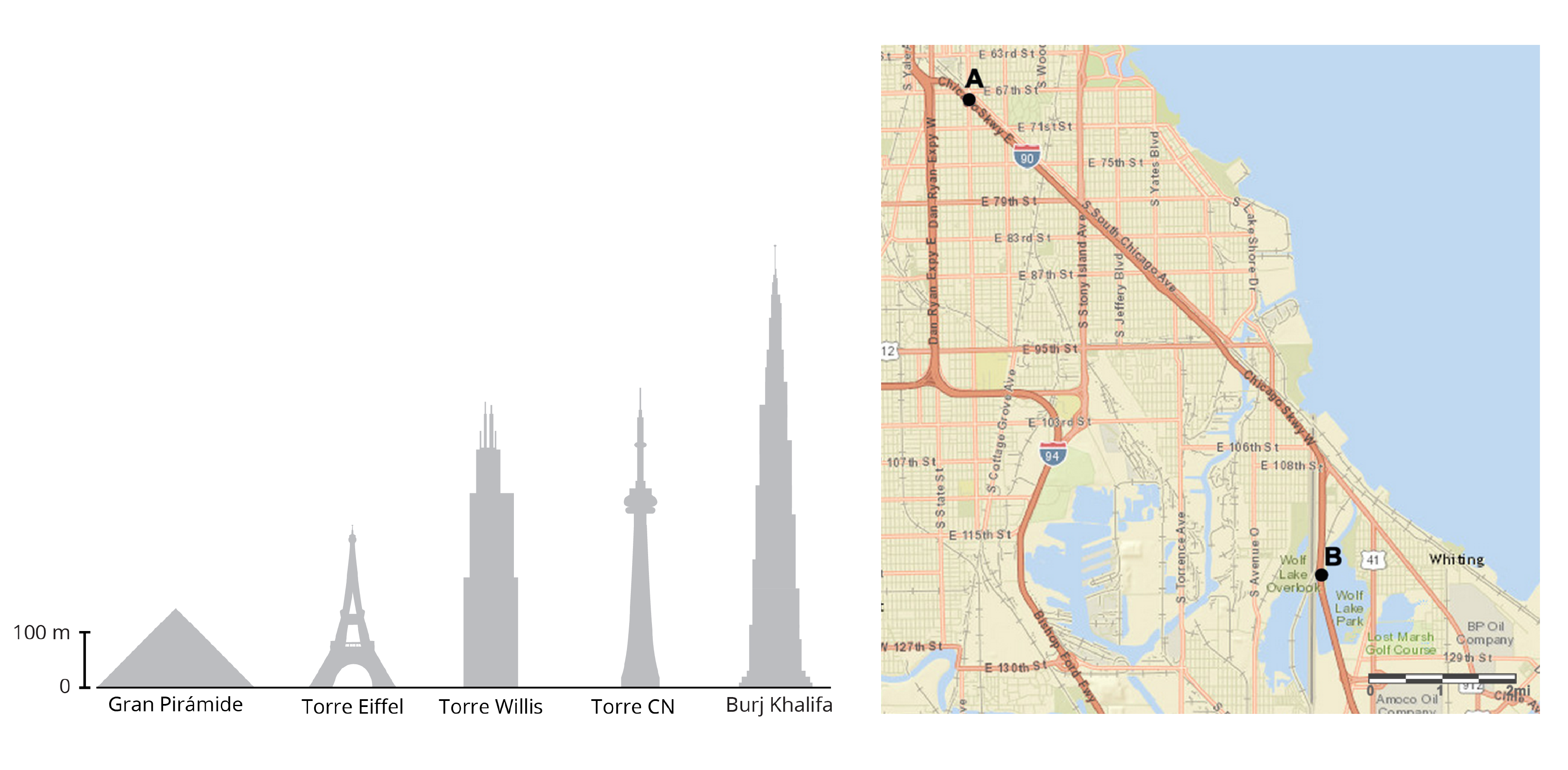 La escala nos dice la longitud real que representa una longitud en el dibujo a escala. Por ejemplo, una escala de “1 pulgada a 5 millas” significa que 1 pulgada en el dibujo a escala representa 5 millas en la realidad. Si el dibujo muestra una calle que mide 2 pulgadas de largo, sabemos que la calle en realidad mide \(2 \boldcdot 5\), es decir, 10 millas de largo.