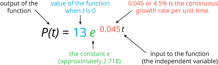 This section introduces the constant as a value often used as a base for exponential functions exhibiting continuous growth. First, they look for a connection between and the expression . Then, students look at contexts comparing continuous growth rates to discrete growth rates before turning to the natural logarithm as a way to solve equations stemming from these contexts.