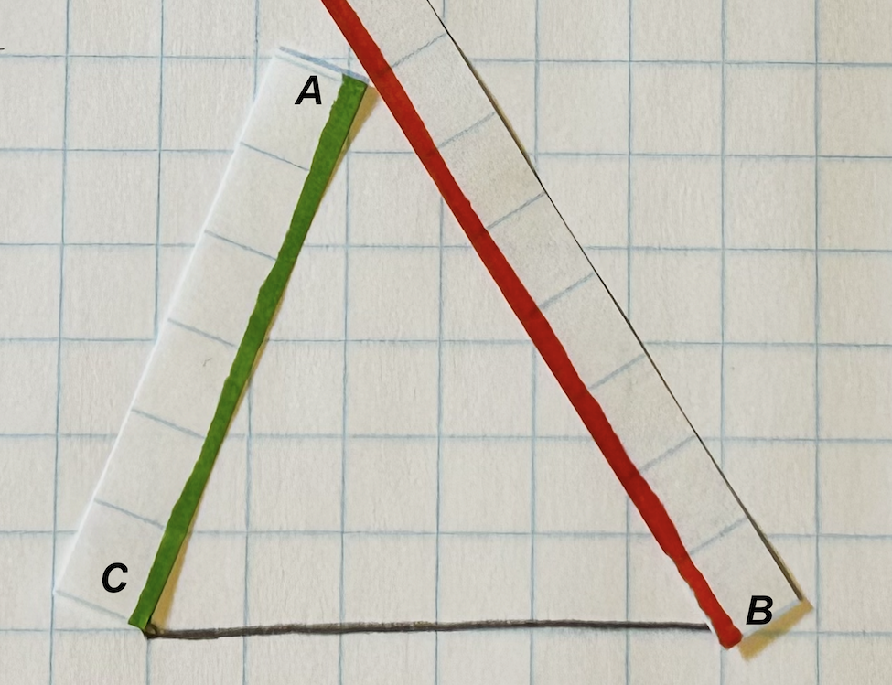 Once students are arranged in groups, demonstrate how to set up two sides of a triangle using a line drawn on the graph paper and the short grid strip. Now two sides of the triangle have a fixed length. The long grid strip is used to help measure potential lengths for the third side of the triangle. Tell students to use whole-number side lengths whenever possible and estimate, if needed, for the right triangle. Explain how coloring one edge of each grid strip might help students more easily measure the length of the third side of a triangle. Students should keep their grid strips and graph paper for the next activity.