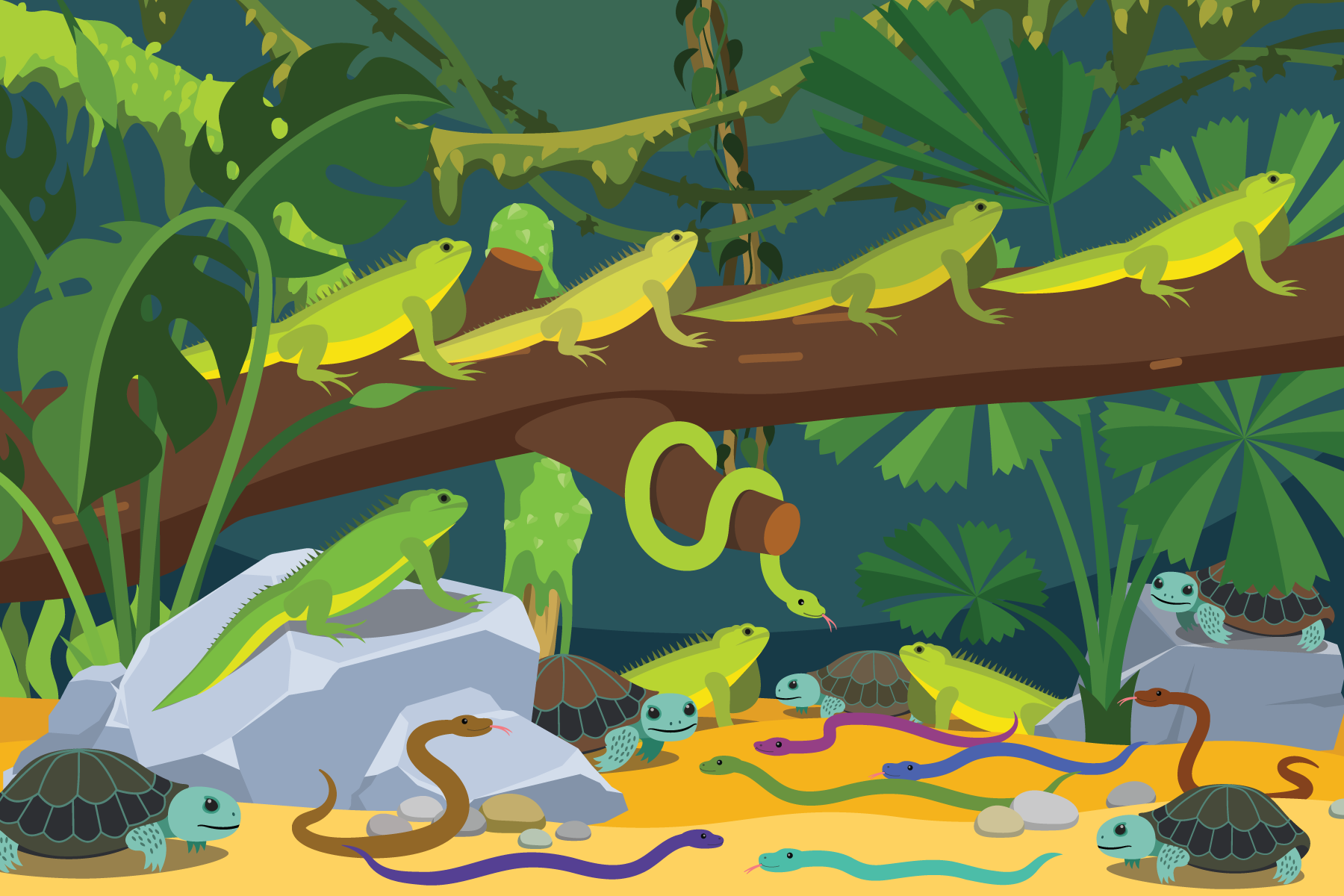 Jada fue al zoológico con su familia. Vieron reptiles. Vieron 8 serpientes, 7 iguanas y 5 tortugas.