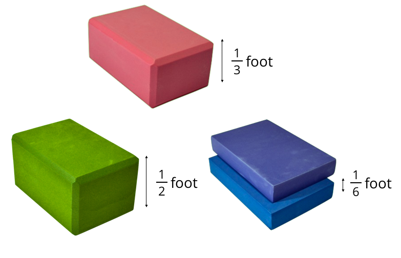 Andre is building a tower out of foam blocks. The blocks come in three different thicknesses: foot, foot, and foot.